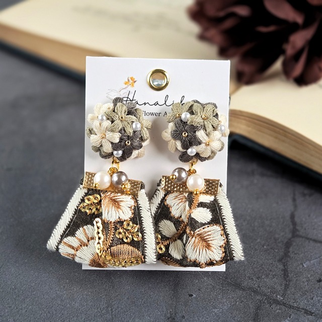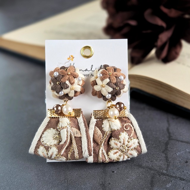 【オータムブラウン】インド刺繍リボンイヤリング/ピアス|刺繍アクセサリー|上品くすみカラー