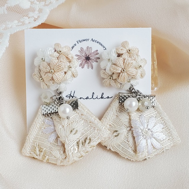 【クラシカルベージュリボン】インド刺繍リボンイヤリング/ピアス|刺繍アクセサリー|上品くすみカラー