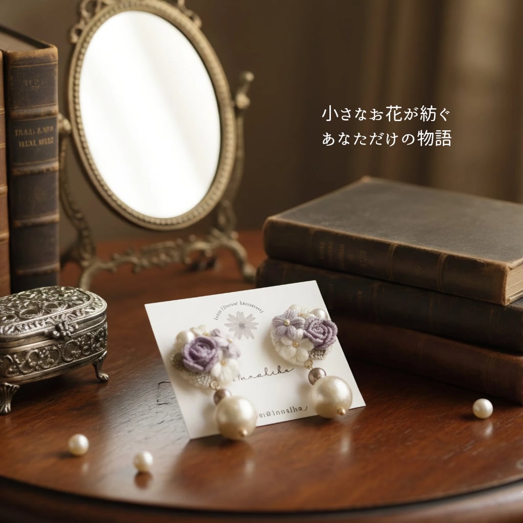 一本の刺繍糸から丁寧に編み上げた、 小さな薔薇を主役にした刺繍アクセサリー。 繊細な薔薇に小花やパールを添え、ブーケのように立体的に仕立てました。 耳元でやさしく揺れる大粒パールは、冬の霜や雪を思わせる、上品でやわらかな艶感です。 淡色カラーで甘くなりすぎず、ナチュラルからきれいめ、フォーマルまで幅広くお使いいただけます。 .*・゚┈┈┈┈┈┈┈┈┈┈┈┈┈┈┈┈┈゚・*.︎ ■ 特徴 刺繍糸一本から手編みした薔薇モチーフ。 小ぶりで軽く、普段使いしやすいブーケのような立体感。 揺れる大粒パールが上品な印象。 ■ 金具について ピアス/イヤリングをお選びいただけます。 ・基本金具(無料) ①サージカルステンレスピアス ②ネジバネ式イヤリング ・オプション金具(+200円) ③チタンポストピアス ④サージカルステンレスイヤリング ■ 素材・サイズ ・刺繍糸、パールビーズ、シードビーズ ・モチーフ直径:約2cm ・全長:約4.3cm ※手作業のため個体差がございます。 ■ ご注意 水濡れや強い摩擦はお避けください。 使用後はやわらかい布で拭き、湿気を避けて保管してください。