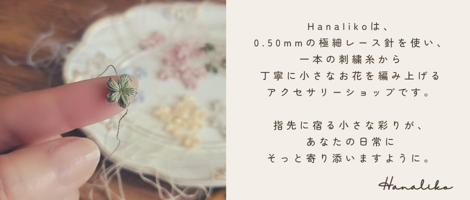 このたびは刺繍糸で紡ぐ小さなお花工房、 Hanaliko/ハナリコ へお越しいただき、ありがとうございます⚘⡱ 皆様に安心してご購入いただけますように、ショッピングガイドのご確認をお願いしております。 ■商品について■ ▷長くお使いいただけるように小花刺繍は表面コーティングをしておりますが、刺繍糸を使った繊細な作品になりますので引っ掛かりや水濡れにはご注意下さい。 ▷作品は手刺繍で制作しておりますのでひとつひとつ表情が違います。世界に一つだけの「個性」としてお楽しみいただけましたら幸いです。 ▷お使いの端末によって、写真と実際の色味等が若干異なって見える場合がございますのでご了承ください。 ■アレルギー対応金具について■ 当店では、医療用の工具にも使用されているサージカルステンレス製のピアス金具を使用しております。 アレルギー性の極めて低い素材ですが、アレルギーには個人差がございます。 全ての方にアレルギー反応が出ないことを保証するものではございませんのでご注意くださいませ。 ■納入日■ ご注文いただいてからひとつひとつお仕立てさせていただきますので、発送まで約5日~7日程お時間をいただいております。ご了承ください。 ■発送方法■ ▷手作りのアクセサリーボックスと水濡れ防止用のOPP袋に入れて発送致します。 ▷クリックポスト/追跡あり/ポスト投函 ※ポストの形状により手渡しになる場合があります。 ■返品について■ 検品は細心の注意を払って行なっておりますが、不備がございましたら、大変お手数ですが到着後、5日以内にショップのお問い合わせ機能、又はInstagramのDMよりご連絡をお願い致します。 お客様のご都合による返品は、受け付る事ができません。ご理解の程よろしくお願い致します。 ※その他ご不明な点、ご質問などございましたらお気軽にメッセージ下さいませ。 最後までご覧いただきありがとうございます♡ ごゆっくりお買い物をお楽しみ下さいませ。 Hanaliko/ハナリコ