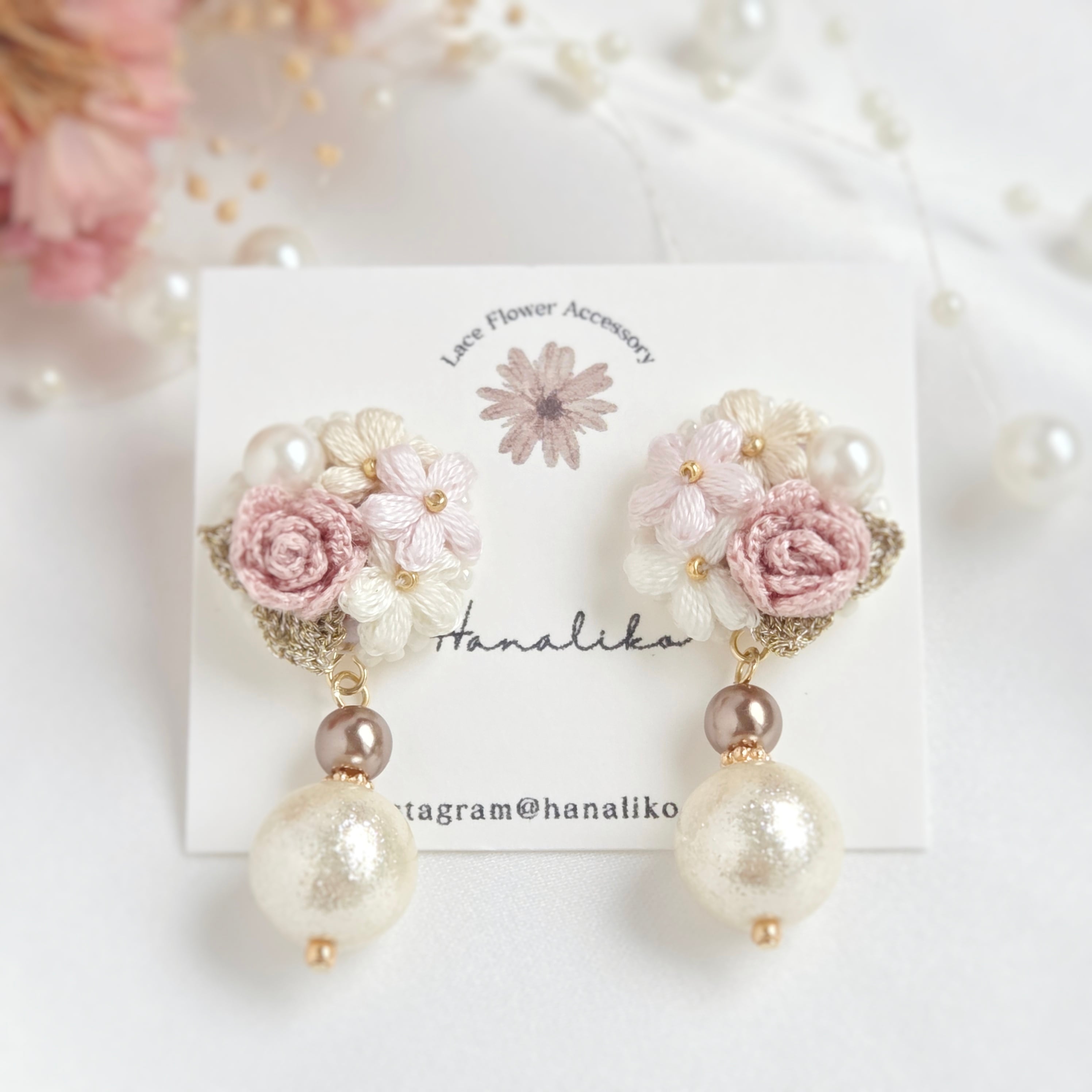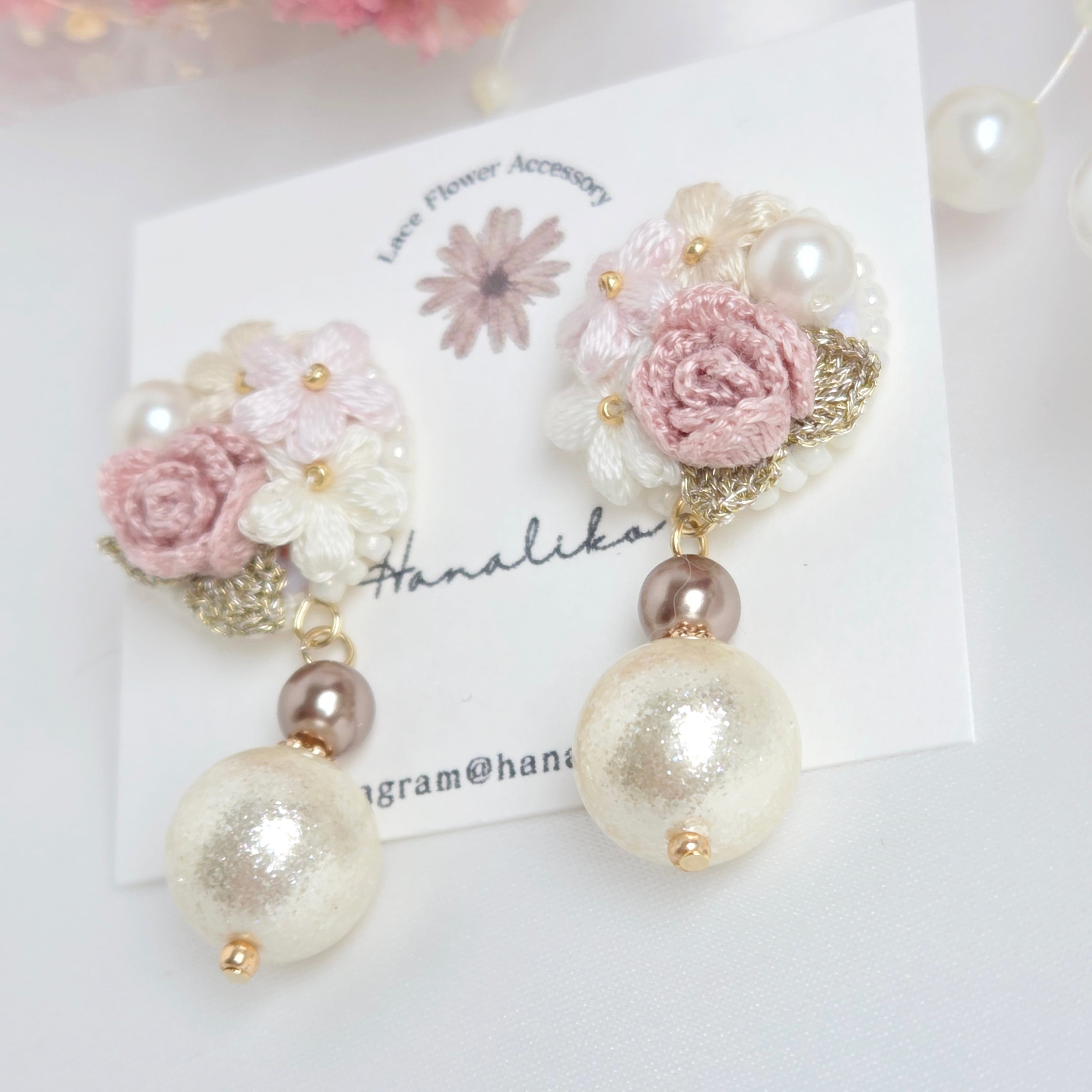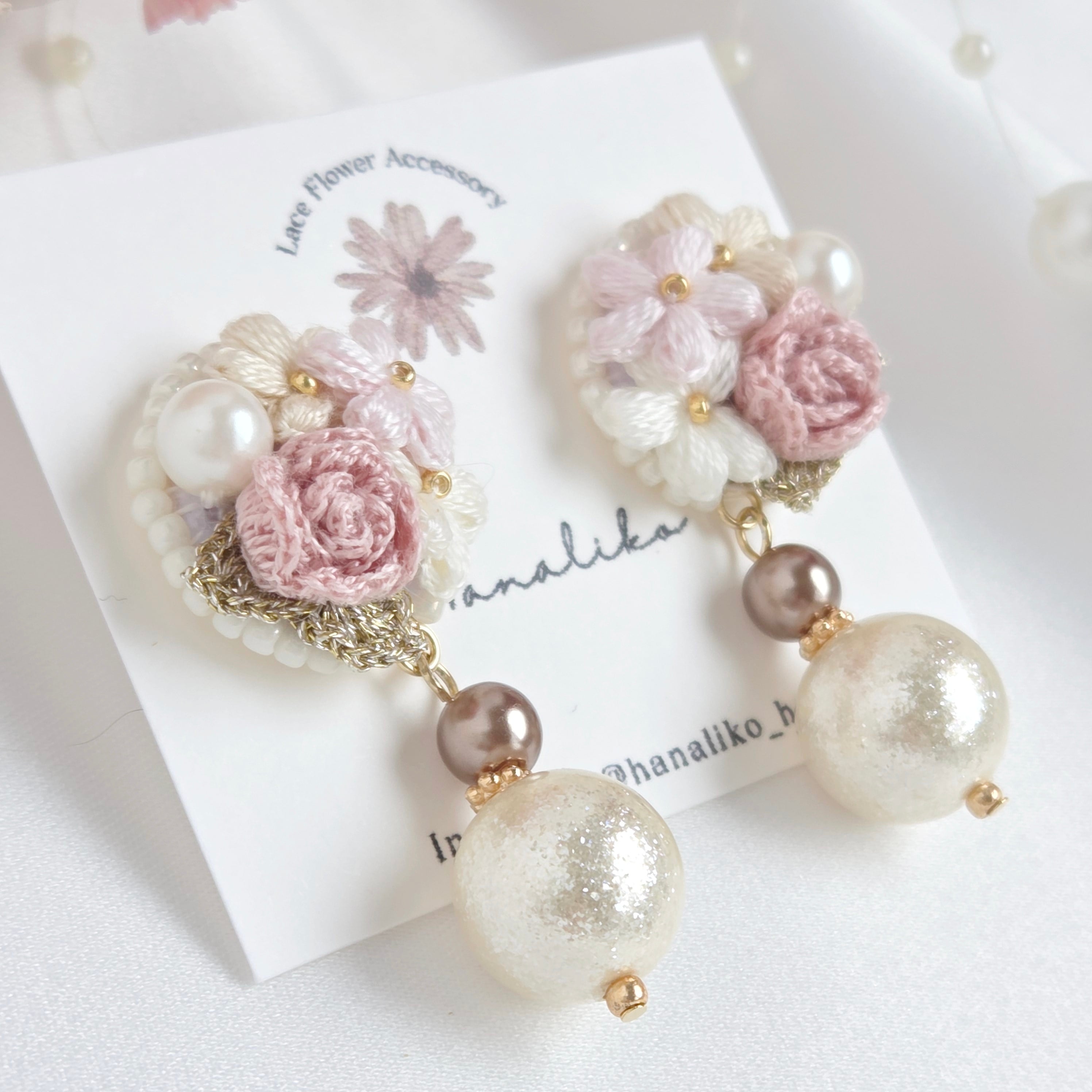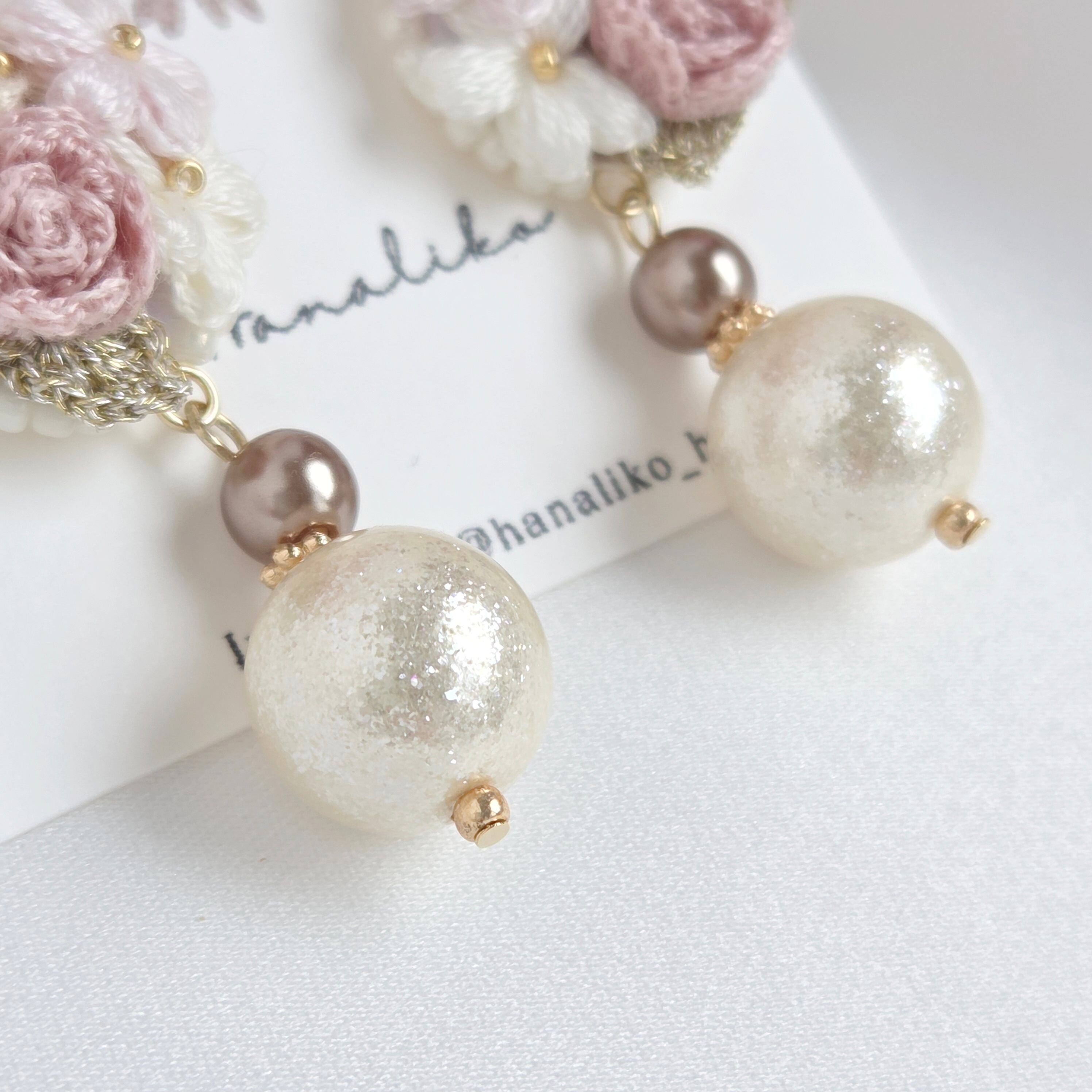 【ピンクローズ】刺繍糸の薔薇ブーケと大粒パールが揺れるピアス|イヤリング